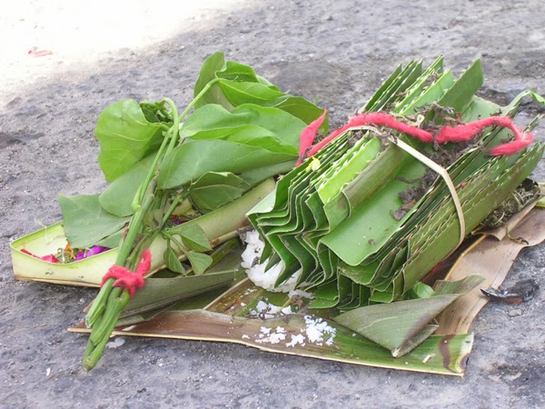 Daun pandan tersebut dialasi dengan sebuah sidi(ayakan) serta diisi juga sebuah takir berisi kapur sirih dan benang tri datu (tiga warna: merah, hitam, putih) sepanjang dua jengkal, lengkap dengan canang sari. Di dalam sidi diisi sebuah takir lagi lengkap dengan tri ketuka (mesui, kesuna, jangu) yang telah digerus.